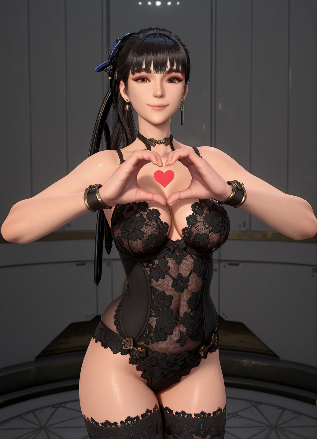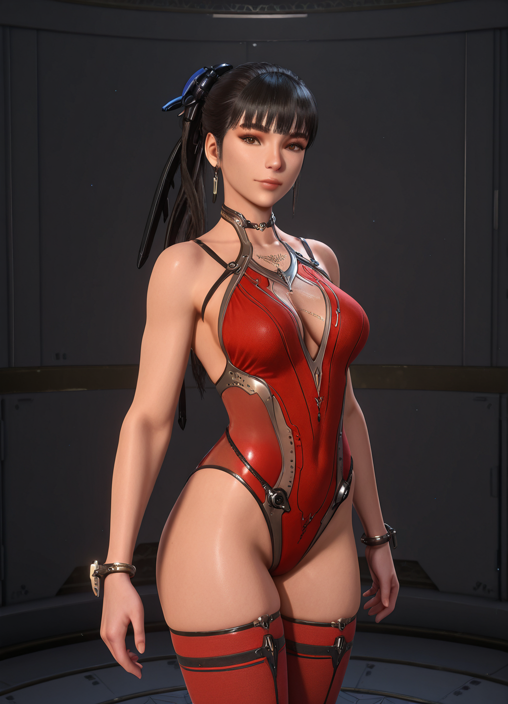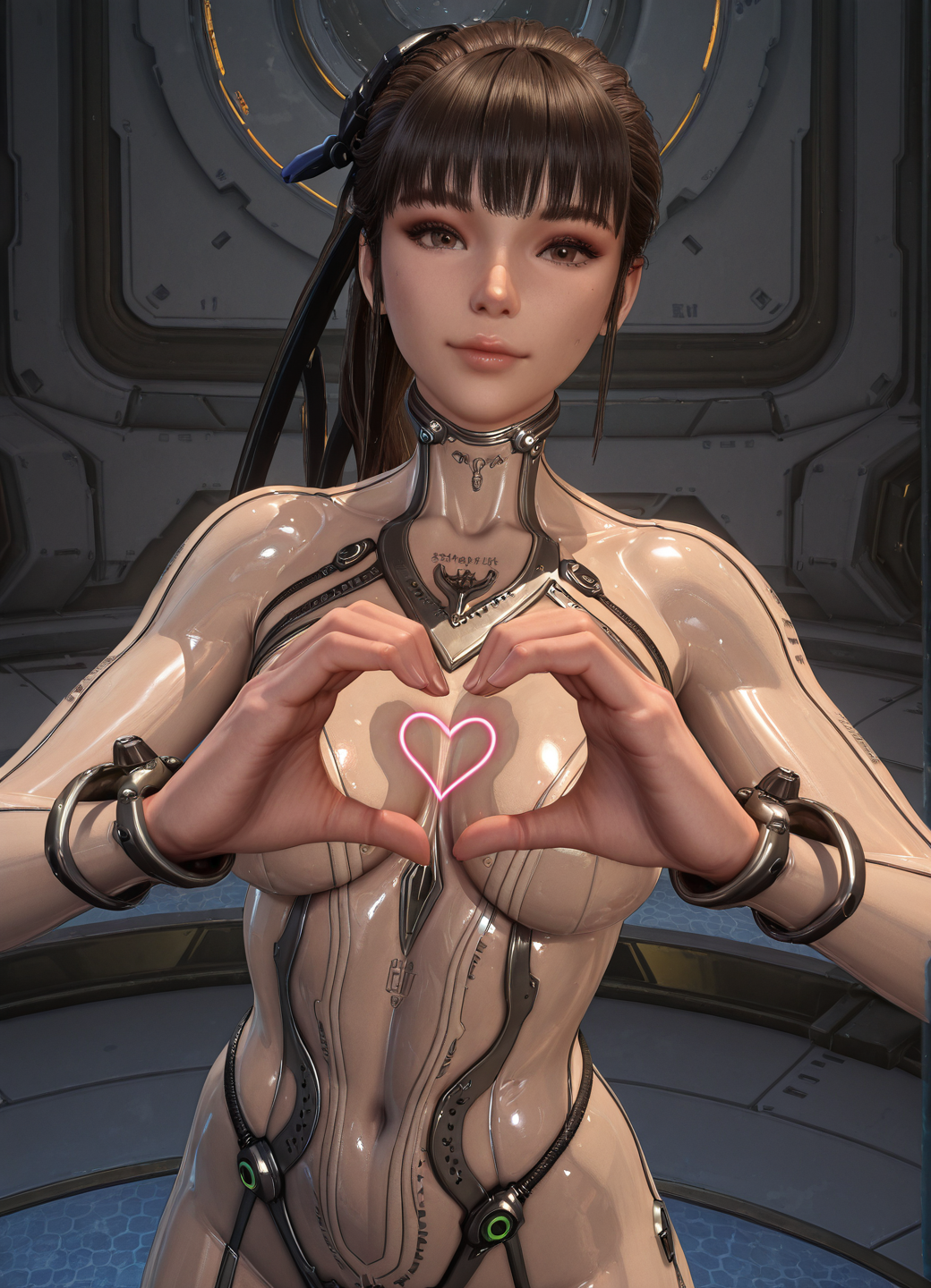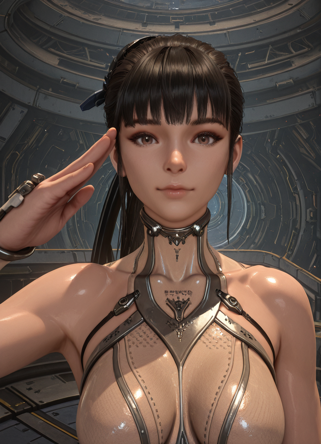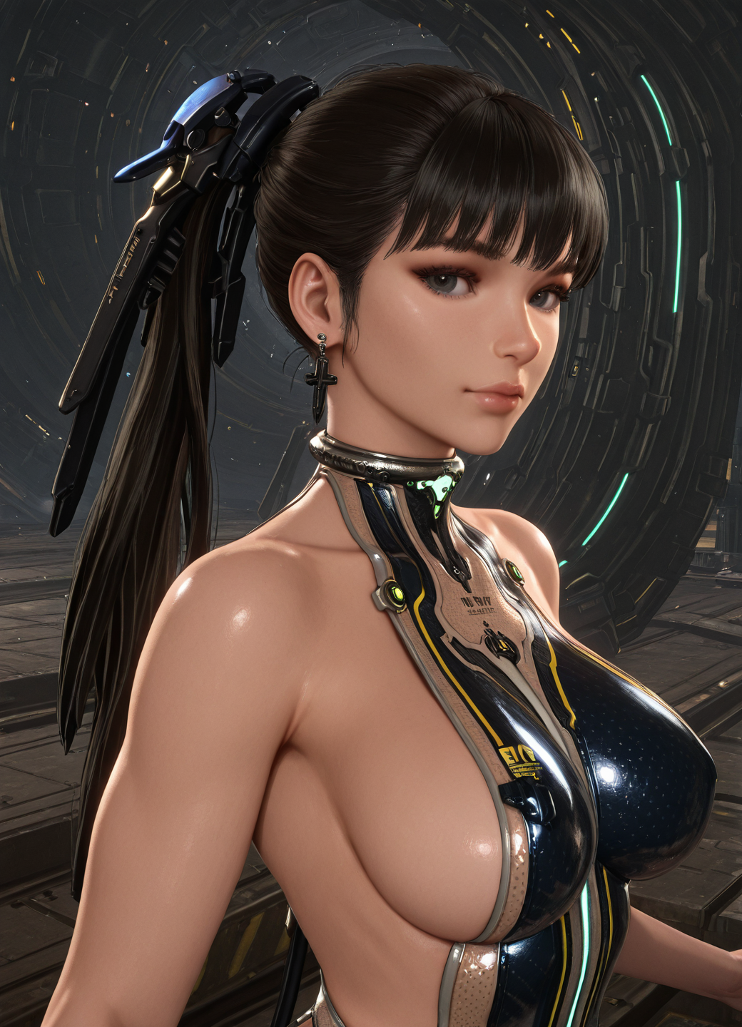 EVE \(stellar blade\),黑发,马尾,发饰,齐刘海,棕色眼睛,纤细腰身,宽臀,中等大小胸部,