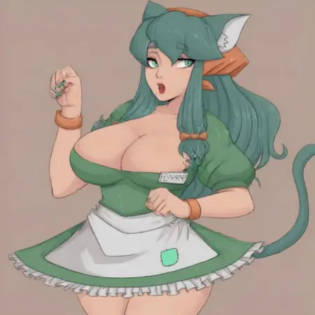 Flora, 1girl, solo, breasts, large breasts, green cat eyes, dark green long hair, orange ribbon in hair, orange scarf in hair, red lipstick, long green nails, animal ears, cat ears, tail, cat tail, cleavage, green and white diner waitress dress, orange bracelet