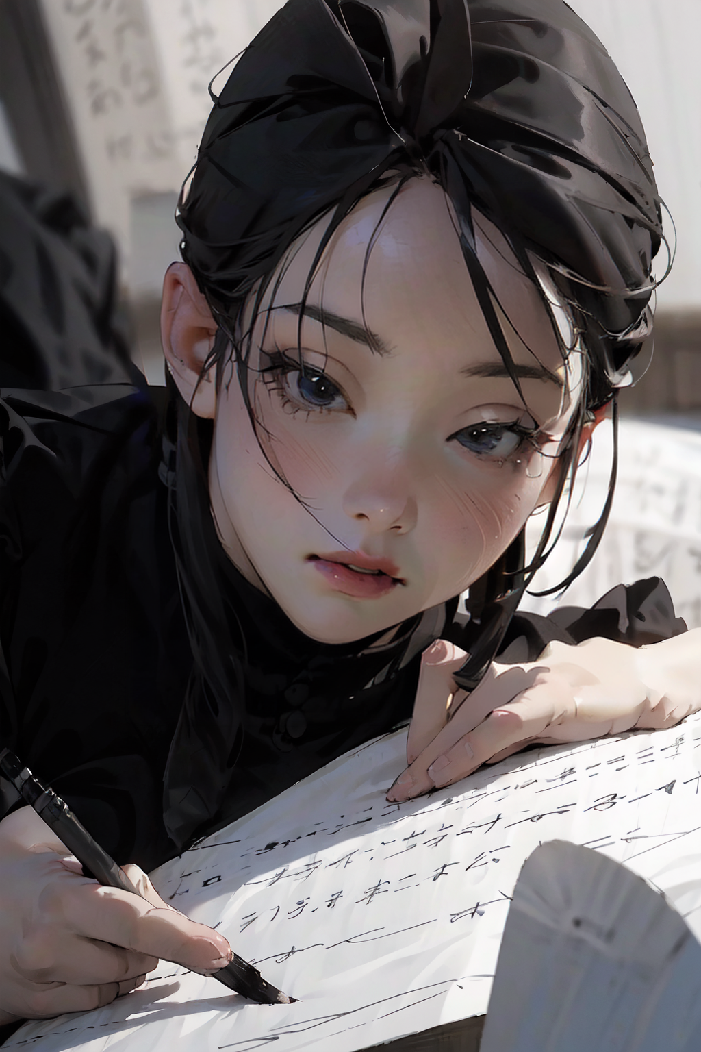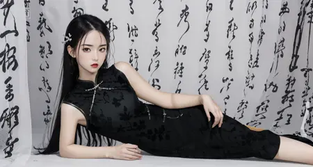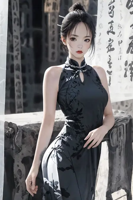 推荐tag:1 girl, standing, black cheongsam, calligraphy_background