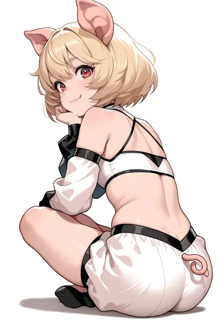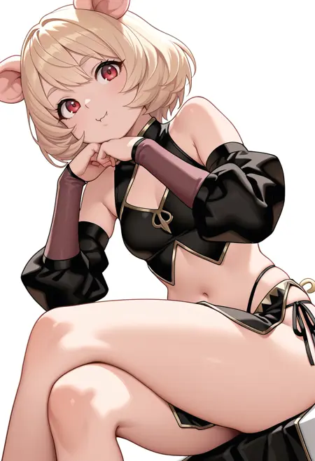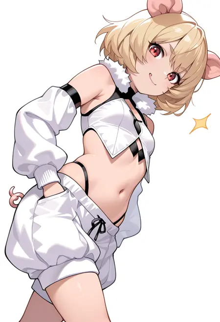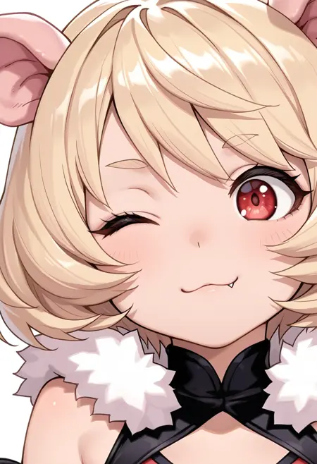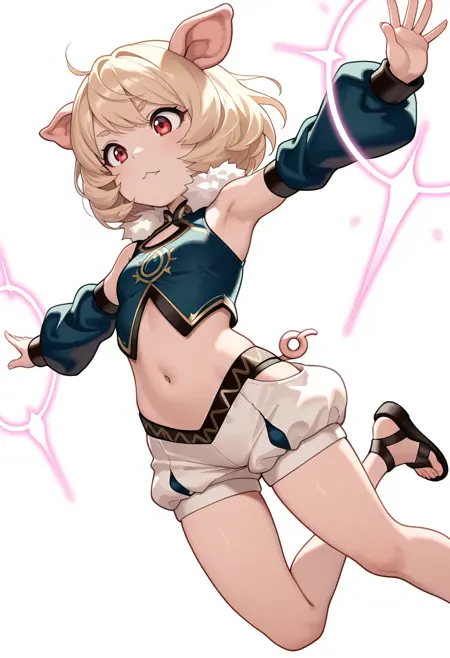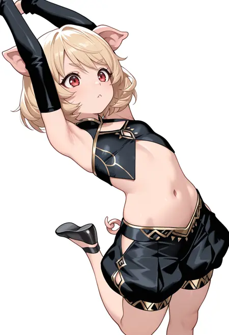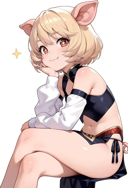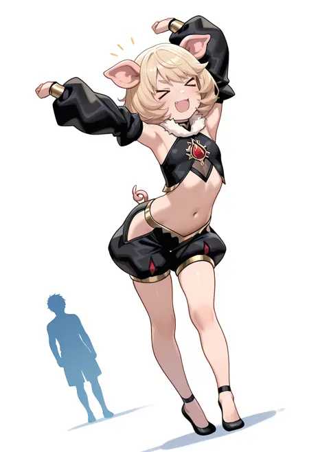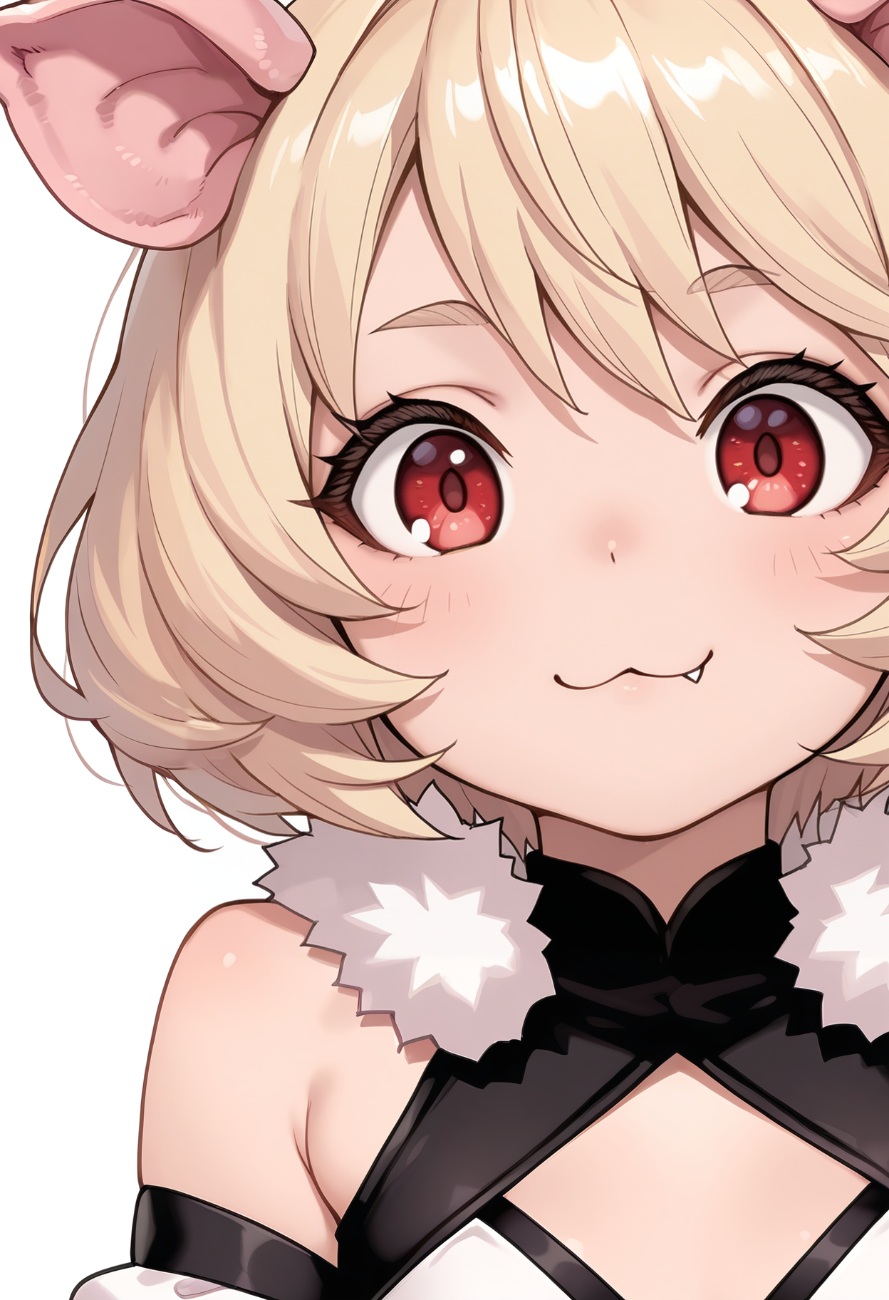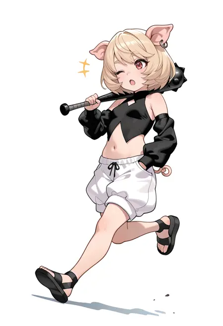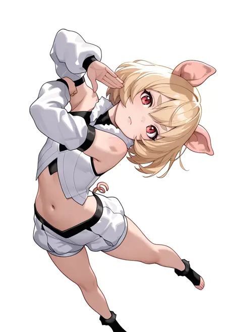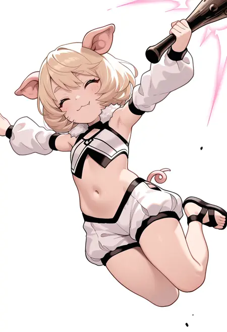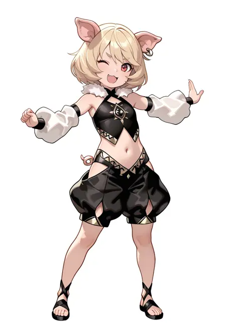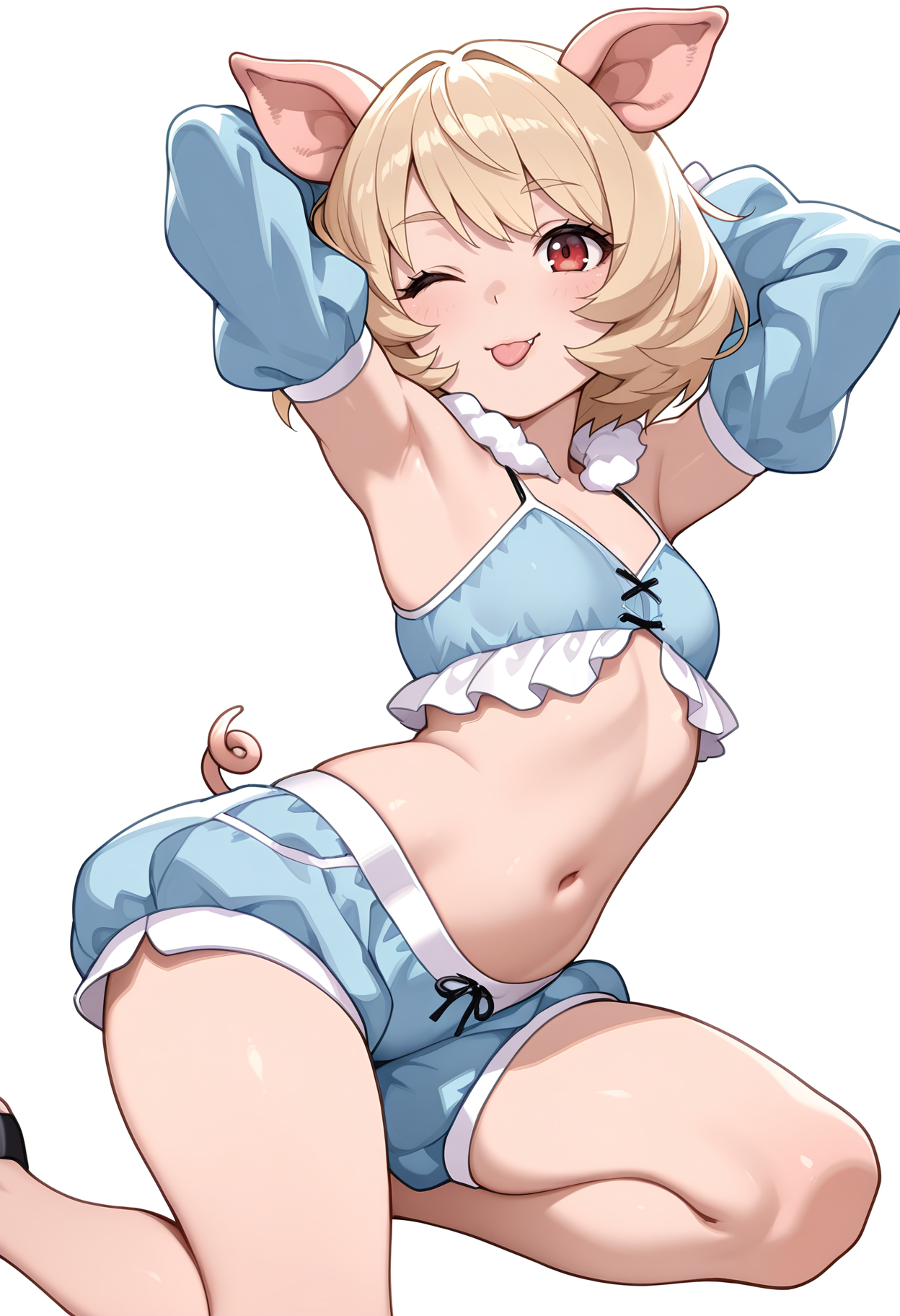 youngpauvina/cnn, 1girl, animal ears, short hair, fang, navel, pig ears, pig tail, blonde hair, red eyes,