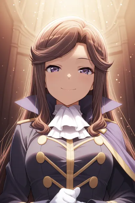 maya, 1girl, skirt, long hair, solo, brown hair, jacket, grey skirt, smile, yellow belt, fur trim, hair bow, pleated skirt, bow, stage outfit