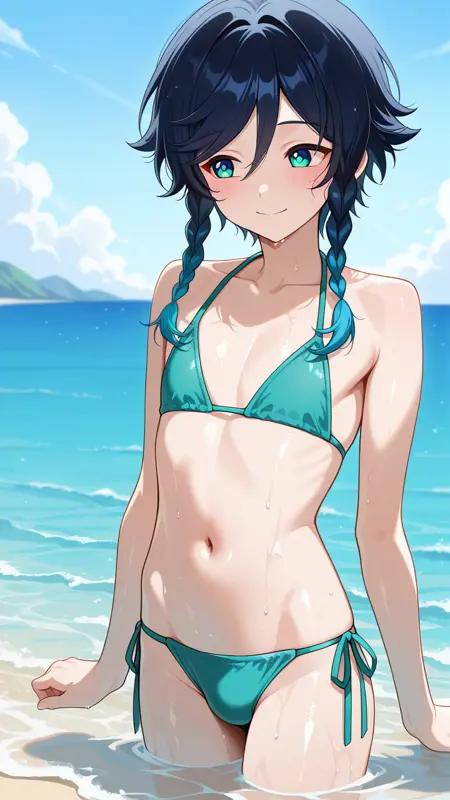 venti (genshin impact), short hair with long locks, aqua hair, green eyes, aqua eyes, blue hair, black hair, braid, gradient hair, twin braids, side braids, hair between eyes, androgynous,