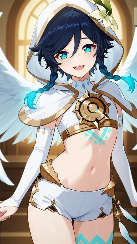 venti (archon) (genshin impact), glowing hair, white hood, hooded capelet, white wings, feathered wings, bridal gauntlets, cecilia flower (genshin impact), white flower, white shirt, crop top, midriff, chest tattoo, glowing tattoo, navel, stomach, white shorts, leg tattoo, single thighhigh,