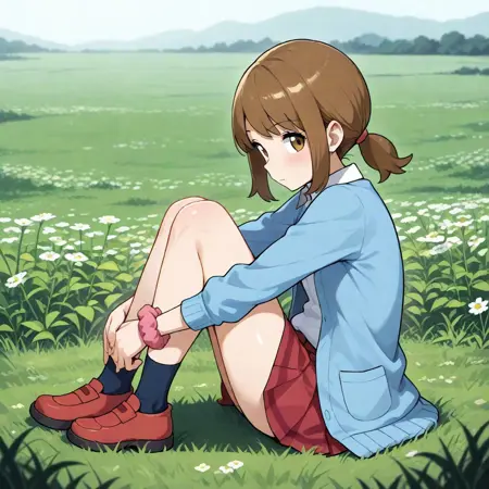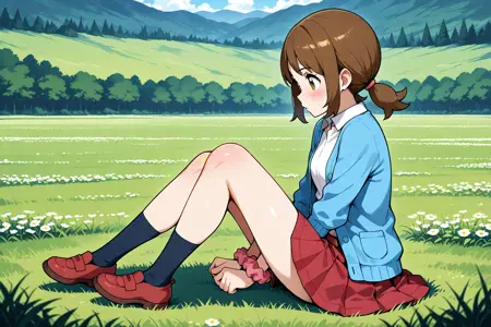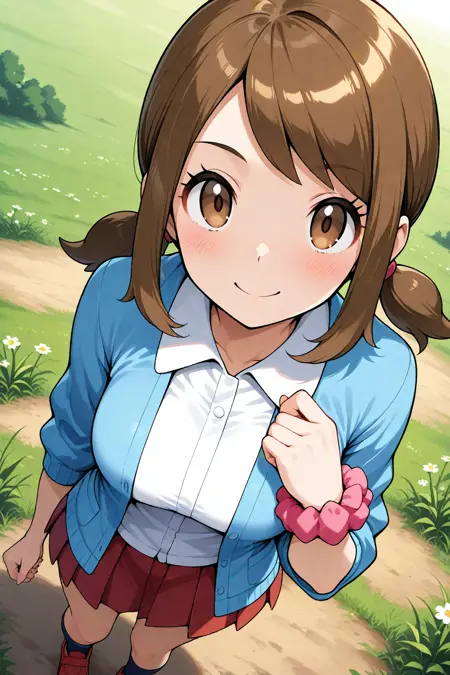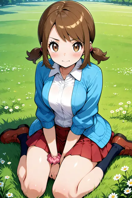lassoras, lass \(pokemon oras\), brown eyes, short twintails, sidelocks, bangs, brown hair, blue cardigan, open cardigan, white shirt, collared shirt, red pleated skirt, wrist scrunchie, pink scrunchie, black socks, shoes, brown footwear