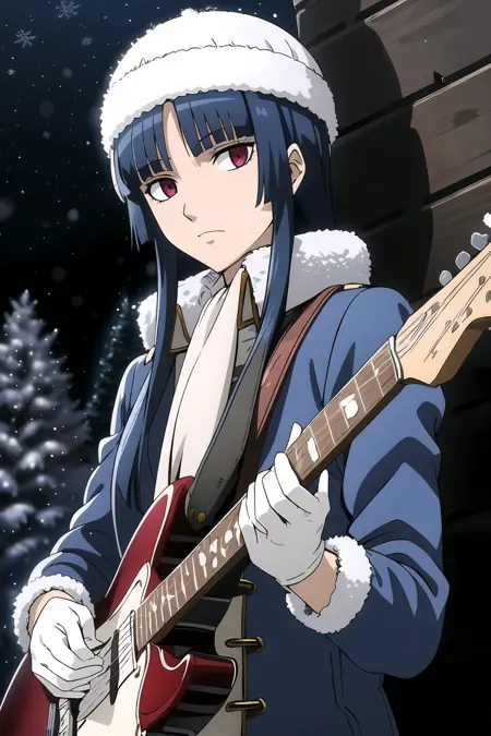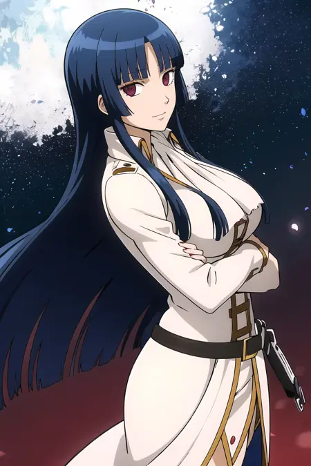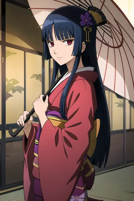 1girl, dark blue hair, blunt bangs, long hair, dark crimson eyes, imai_nobume