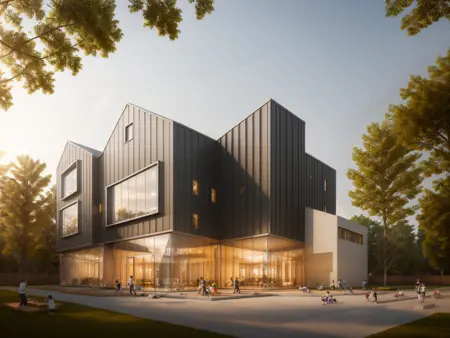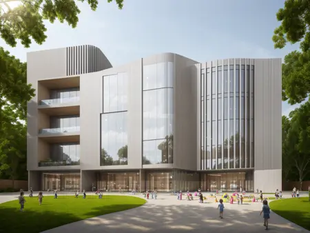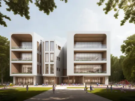 这是一个效果图风格的幼儿园LoRA,整体风格偏素雅,生成效果以木色、格栅、白色、彩色窗框为主。