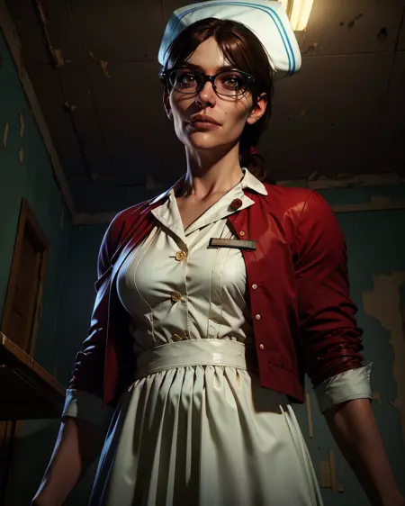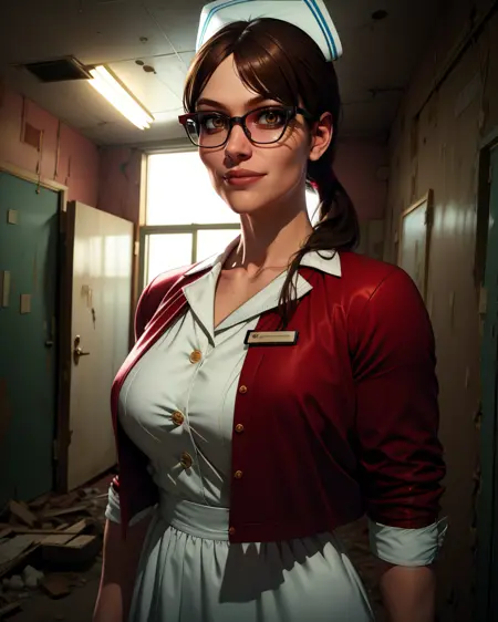 眼镜、护士帽、白色衬衫、红色夹克、丝袜、高跟鞋