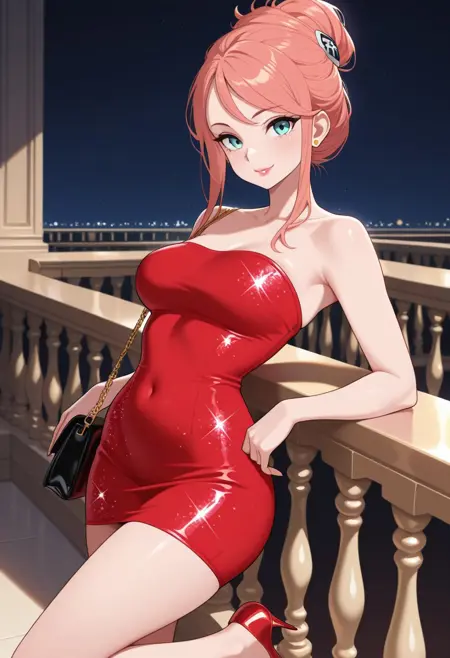 hair bun, formal clothes, red tube dress, glitter dress, short dress, strapless, tight clothes, lipstick, handbag, gold stud earrings, red stiletto heels,