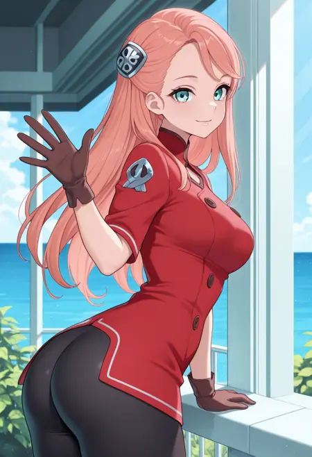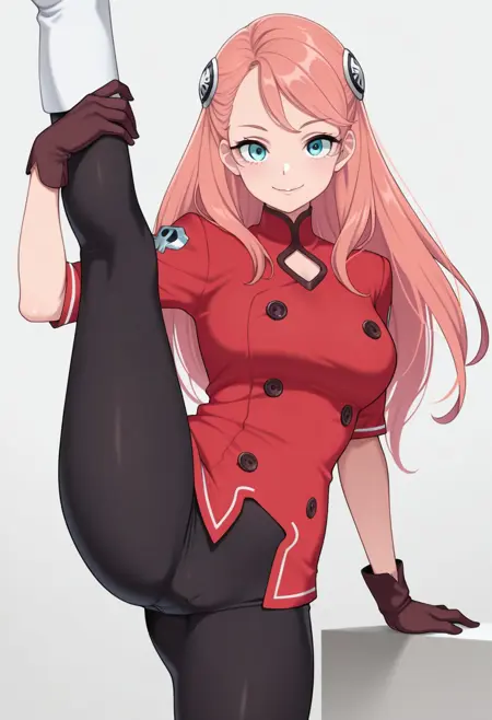 red shirt, high collar, buttons, emblem on shoulder, brown gloves, black leggings, white boots,