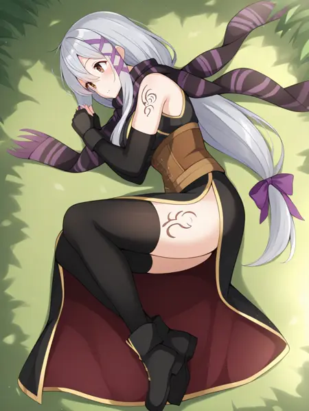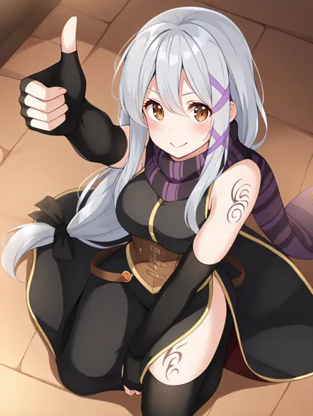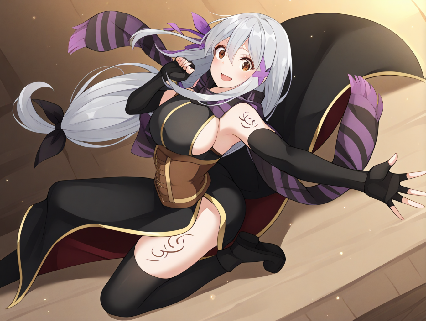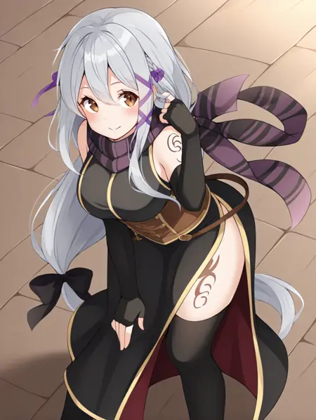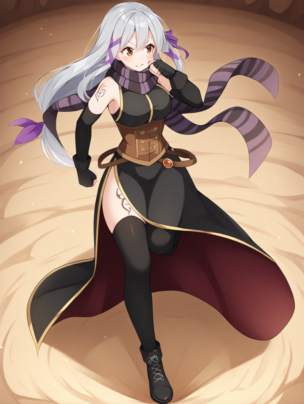 提示示例:kurea,灰发,棕眼,单人,围巾,可拆卸袖子,纹身,紧身胸衣,过膝袜,发带,无袖,肘部手套,露指手套,黑衣,长裙,侧开衩,丝带装饰的头发,金色镶边,条纹围巾,黑色围巾,紫色围巾,低低绑起的长发,交叉系发,