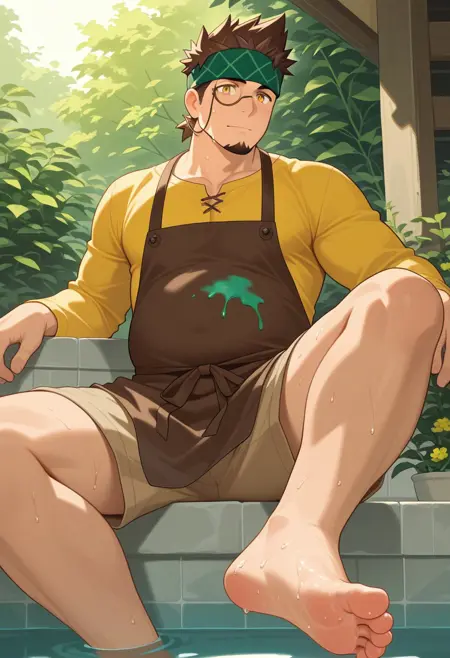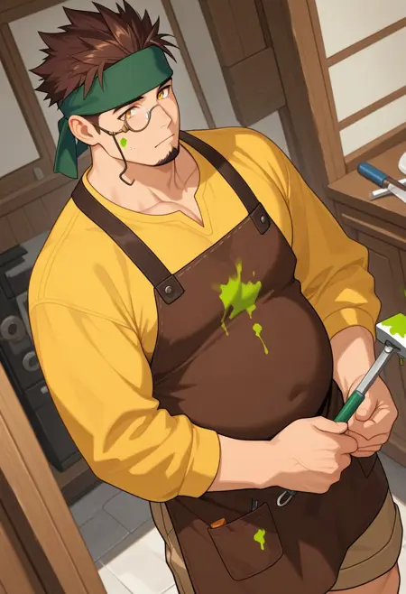 Visual: 1boy, chubby, short hair, brown eyes, goatee, headband, monocle