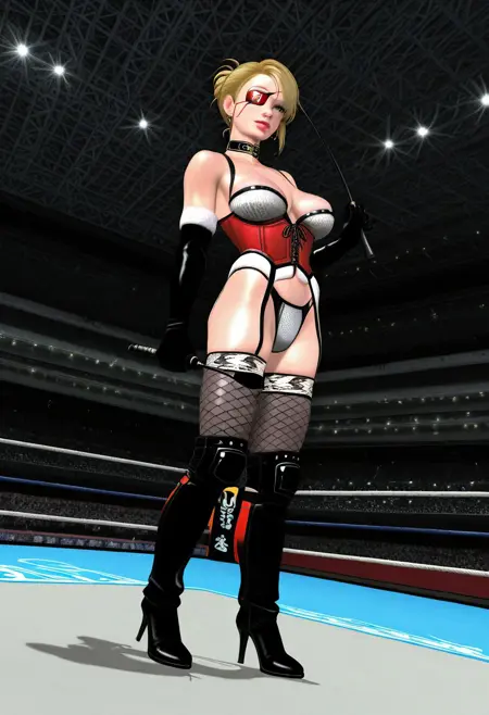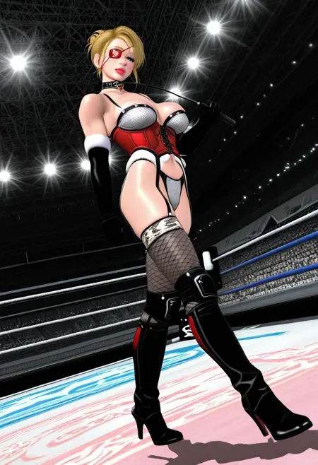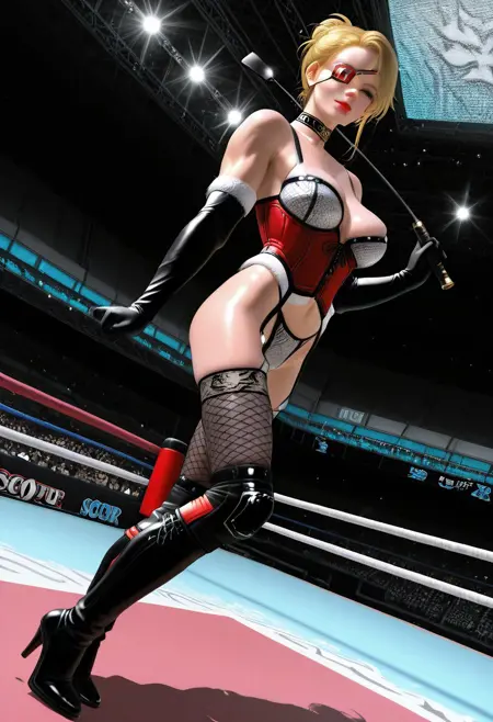 | 训练词汇 | 1girl, dominatrix, thighhighs, eyepatch, blonde_hair, hair_bun, choker, gloves, red corset, collar, boots, large_breasts, saggy_breasts, lips, lingerie, elbow_gloves, fishnets, highleg_panties, bdsm, bustier, riding_crop, high_heels, fishnet_thighhighs, garter_straps, toned_body, fur_fabric, detached_sleeves, left_butt_cheek_tattoo, knee_pads, 3d, high definition 已复制! |