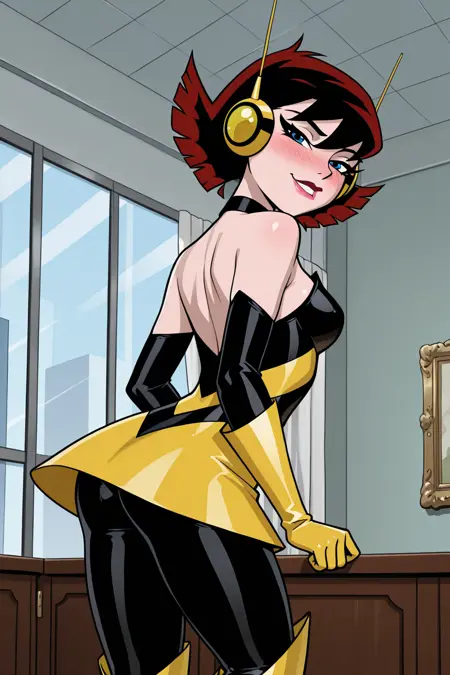 기본 프롬프트: janet van dyne, 단발, 다채로운 머리카락, 빨간 머리, 검은 머리, 파란 눈, 립스틱
