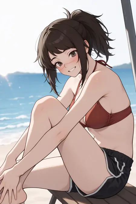 外見:m1ch1k0、鼻の傷、中程度の胸、茶色の目、茶色の髪、サイドロックス、乱れた髪、中程度の長さの髪、ポニーテール