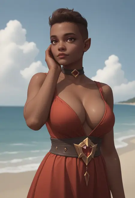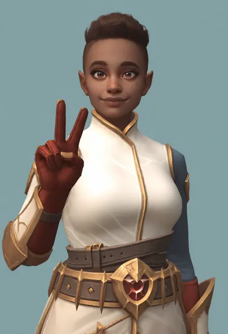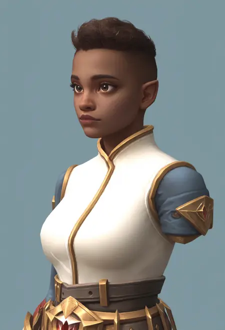 fa3pf, 1girl, brown eyes, brown hair, short hair, dark skin, pointy ears, armor, belt, gloves,