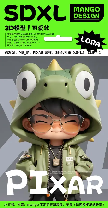 The 3D model based on SDXL training is similar in style to the Pixar style, but the characters are more inclined to the blind box style. In addition to characters, it can also generate some elements such as animals and items. The probability of drawing is more stable. More gameplay you can explore on your own.