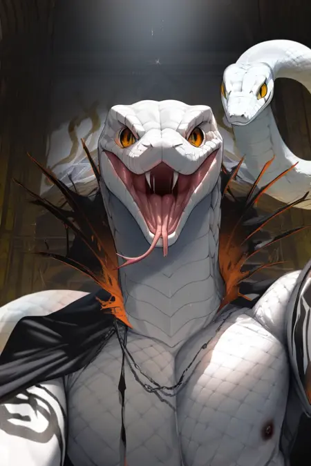 ➡️ 다음처럼 구체적인 요소를 추가하세요:anthro snake, cobra hood, black scales, yellow slit eyes, long tail, reptile tongue, venomous fangs, muscular body