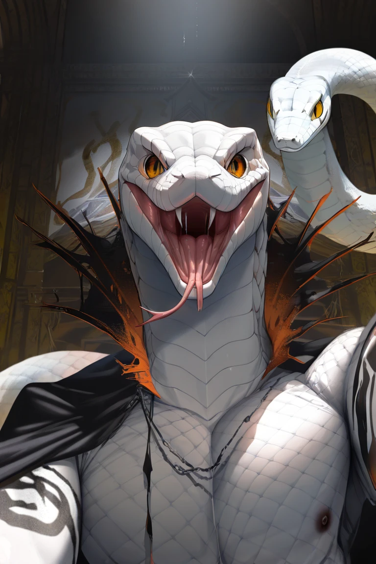 anthro snake, reptile, long tail, scales, snake tongue, slit pupils, sharp teeth, muscular body, smooth body