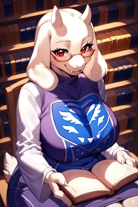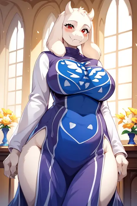 1girl, Toriel, goat girl, goat ears, white fur, furry, furry female, white horns, animal ears, goat horns, snout, fang, red eyes, tail, curvy, thick thighs, wide hips, colored skin, body fur