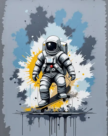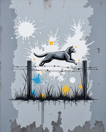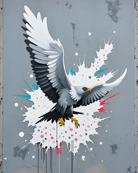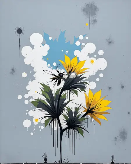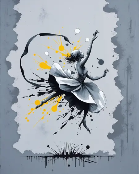 古びた灰色の壁に、柔らかいイエロー、ホワイト、ブルーの色の染みが施されたミニマリストな絵画