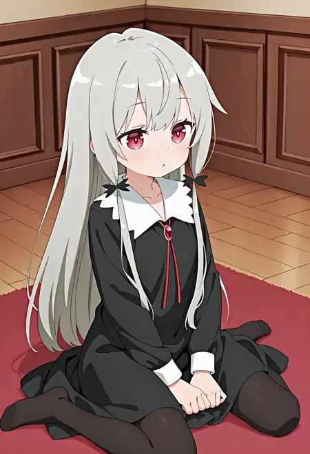 sophie-sailor, sophie twilight, red eyes, grey hair, long hair, white sailor collar, black dress, red ribbon, black pantyhose, black mary janes