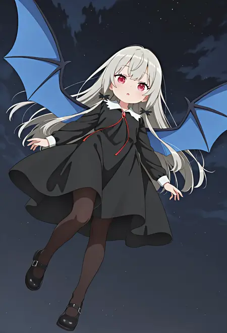 sophie-defgault, sophie twilight, red eyes, grey hair, long hair, black dress, red ribbon, black pantyhose, black mary janes
