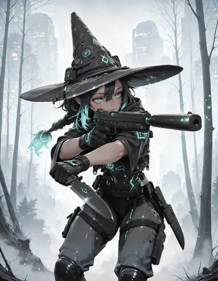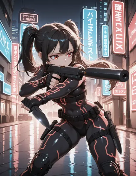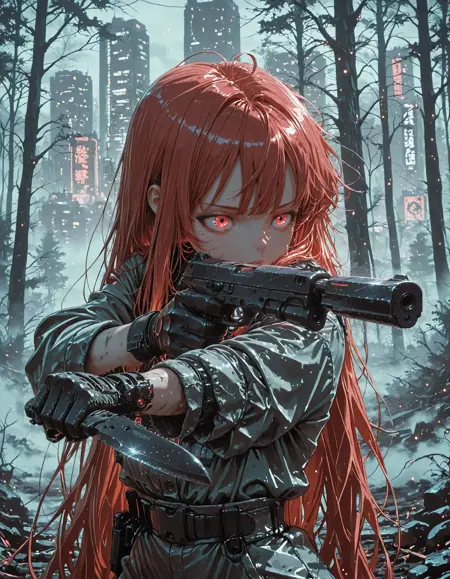1girl, pistol_x_tac_knife, holding pistol and knife, finger on trigger, aiming, combat knife