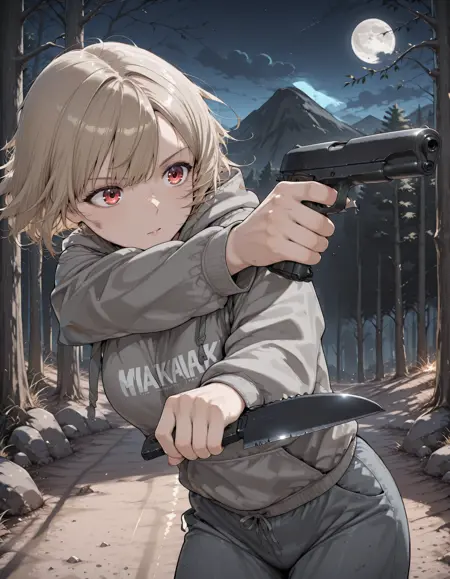 この LoRA は、キャラクターが片手にナイフ、もう片手にピストルを持ち、腕を交差させて構えるポーズを生成します。
