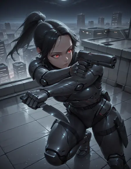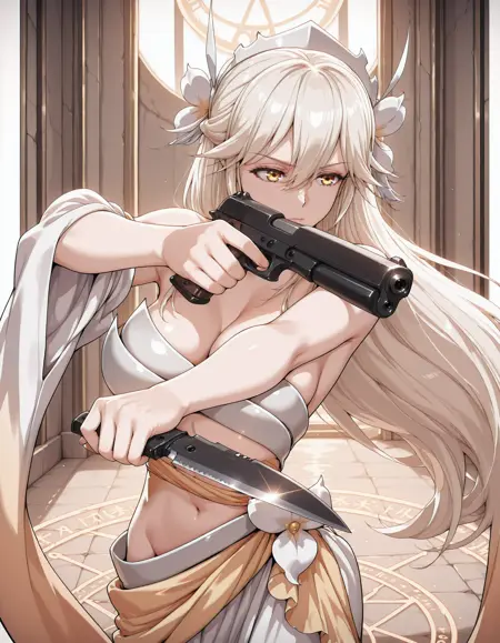 此LoRA生成一种姿势:角色一手持匕首,另一手持手枪,双臂交叉。