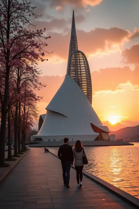 - 구조물을 중앙에 배치하고, 대칭적인 시점이나 소실선을 강조하여 건축물의 유동적인 형태를 부각하세요.