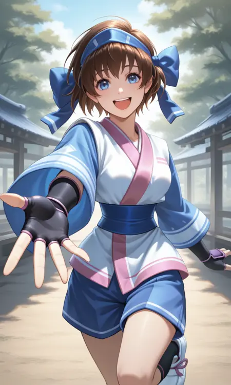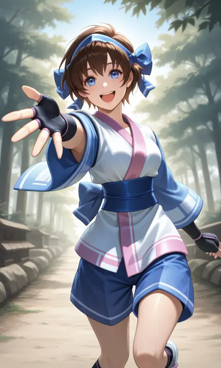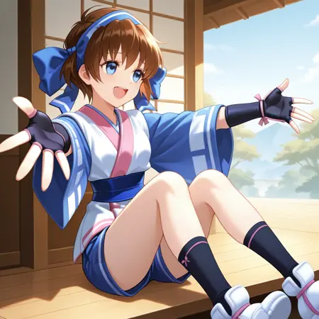 RMRRVSSV,blue eyes,short hair,brown hair,handband,fingerless gauntlet ,Japanese clothes,white shoes,black socks,blue sash,shorts,