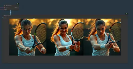 画像を生成する:結合されたプロンプトをFlux生成ワークフロー(「KSampler」と「VAEDecode」ノードを含む)に接続してください。
