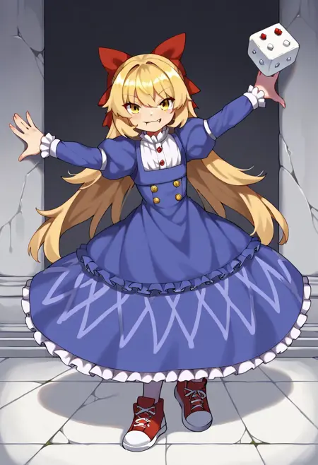 Appearance - yellow eyes, blonde hair, long hair, bangs, red hairbow, :3, fang, fairy wings