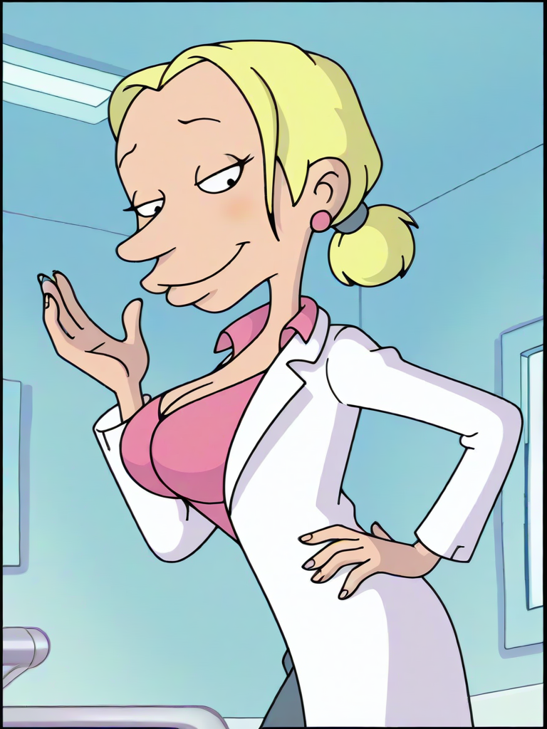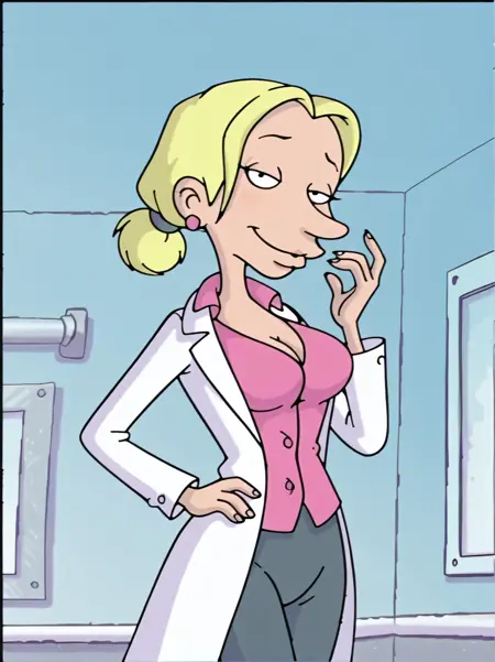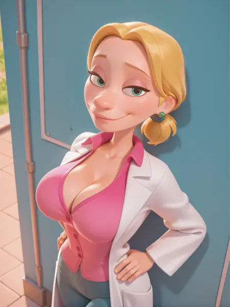 メインプロンプト: "金髪、ポニーテール、ジュエリー、ラボコート、ピンクのシャツ、胸元、ズボン、大きな胸、黒い目"