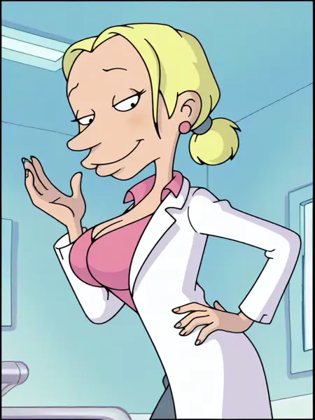 主提示词:"金色头发,马尾辫,首饰,白大褂,粉色上衣,胸部暴露,裤子,大乳房,黑色眼睛"