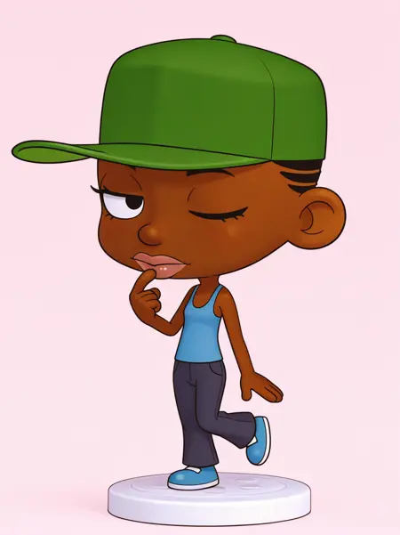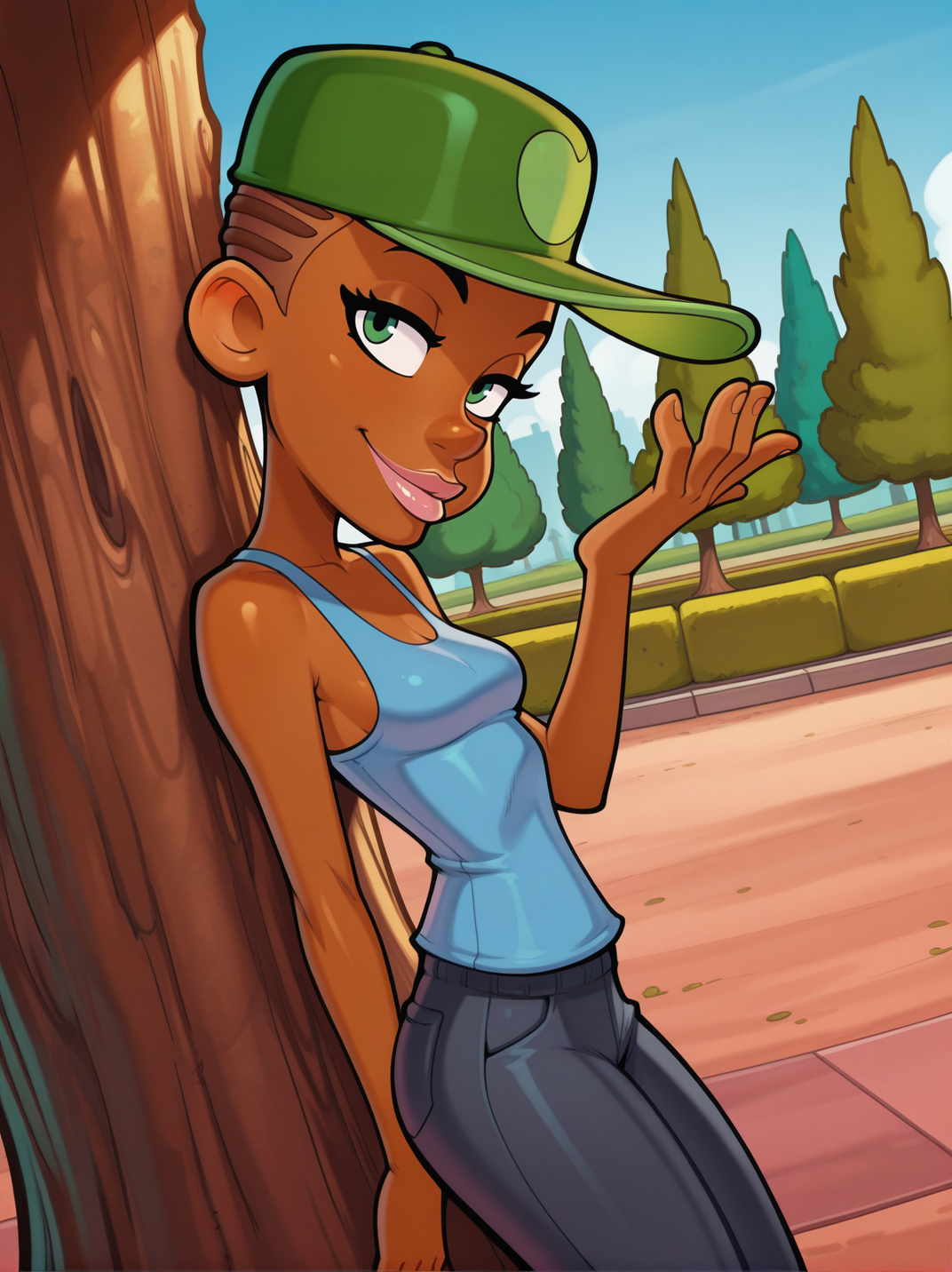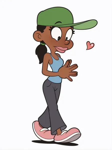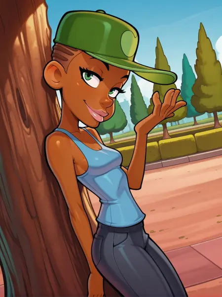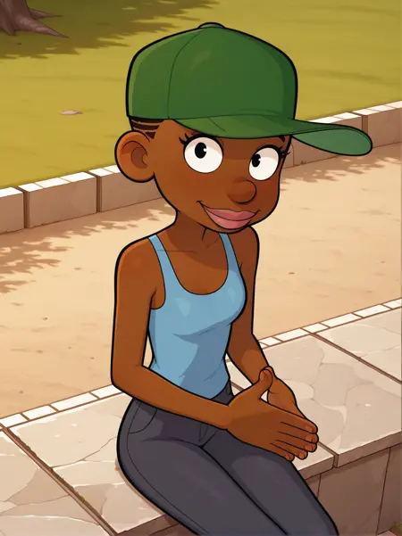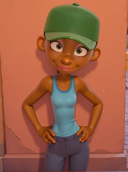 주 프롬프트: "녹색 야구 모자, �ank top, 바지, 검은 피부를 가진 여성"