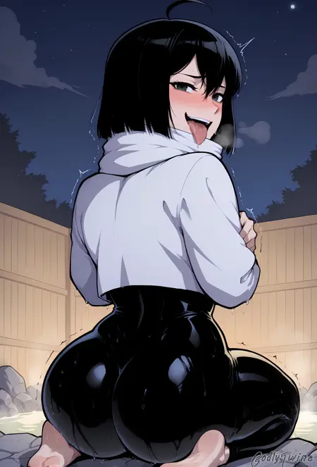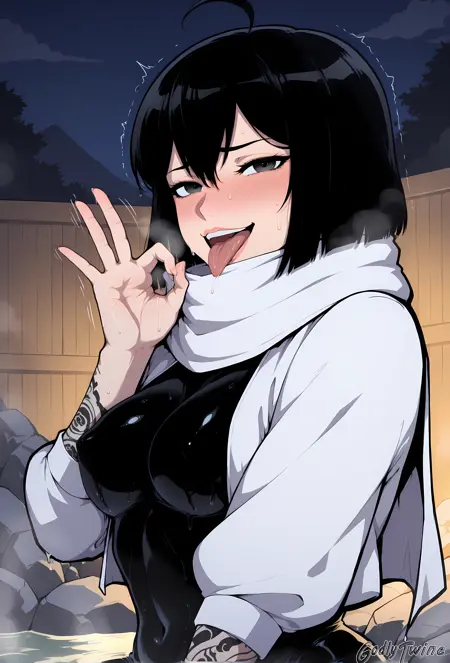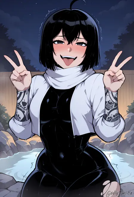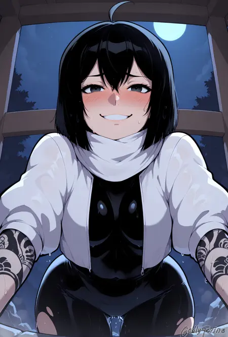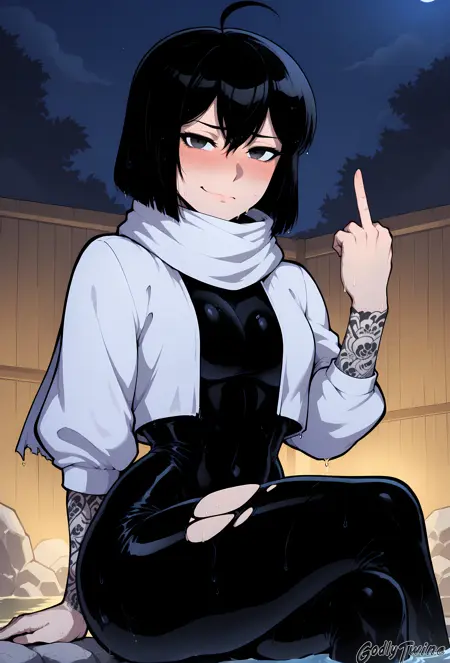 Yona Runcandel,black eyes,short hair,black hair,ahoge,white scarf,white cropped jacket,black bodysuit,skin tight,covered navel,gauntlets,lace arm sleeves