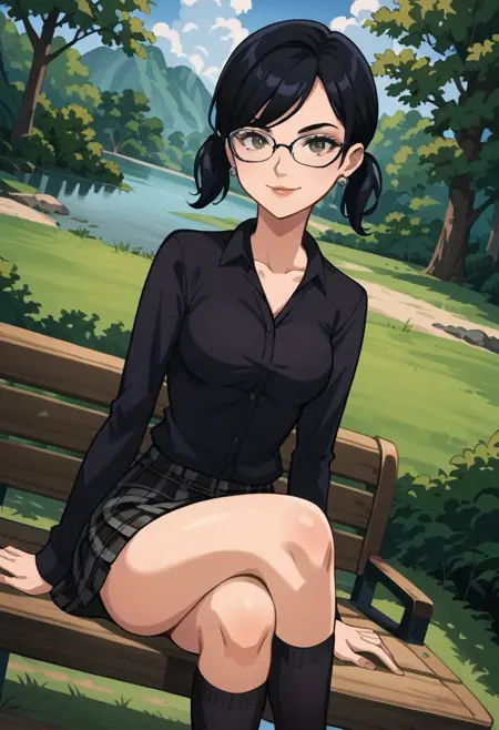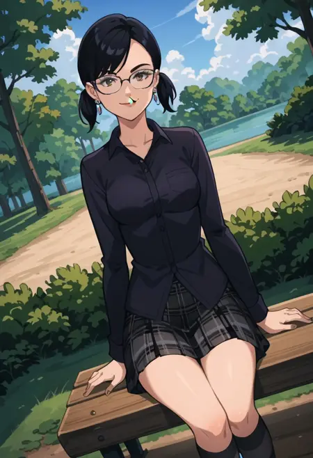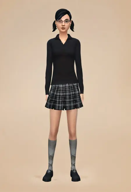 earrings, jewelry, black shirt, collared shirt, , plaid skirt, socks, shoes,