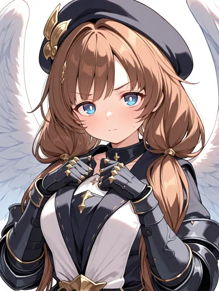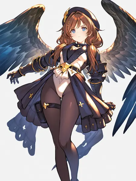 raz, white pupils, blue eyes, low twintails, long hair, brown hair, showgirl skirt, white leotard, wings, beret, gauntlets, uniform, pantyhose