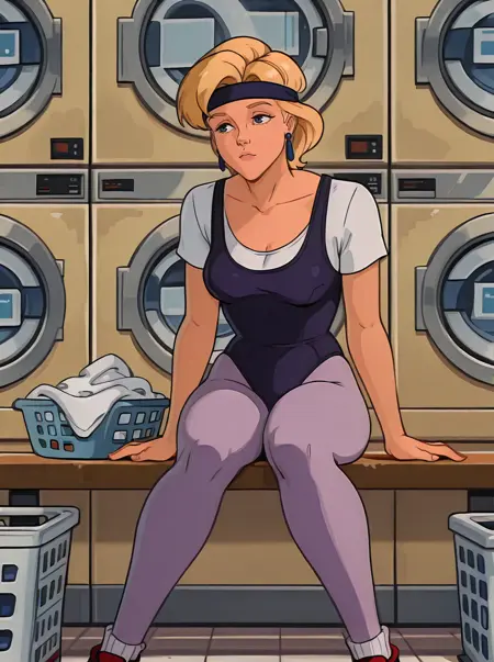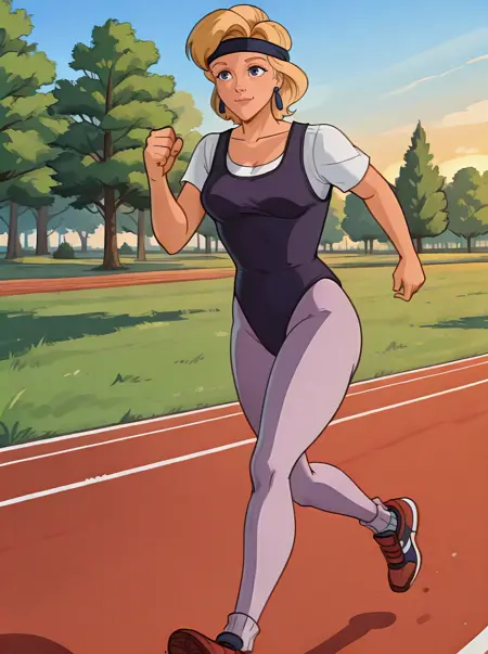 運動着: 青いヘアバンド、青いイヤリング、青いレオタード、白いアンダーシャツ、ラベンダー色のレッグウォーマー、白い靴下、赤いシューズ