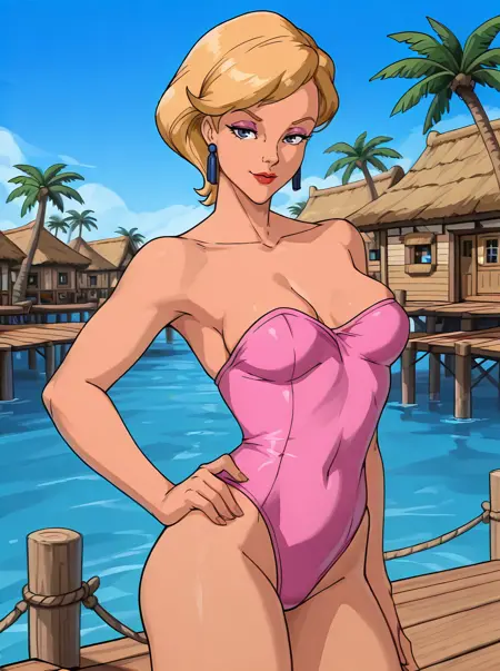 泳装:粉色连体泳衣、蓝色耳环、黄色高跟鞋