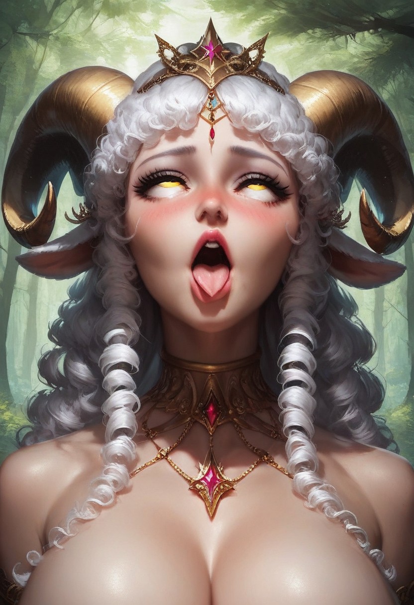 Sena ,sheep girl, animal ears,sheep ears ,yellow eyes, white hair, hair between eyes, long hair,curly hair, ram's horns , big breasts,short tail, black top, neck ring, circlet, gold trim , arabic pants , sandals