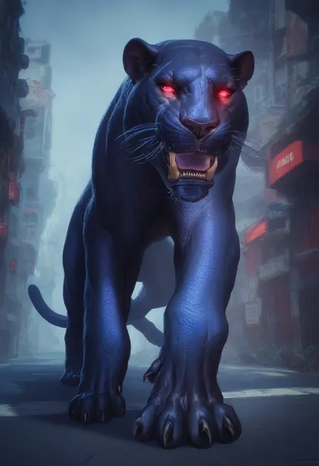 基本タグ:「Shad0w_DMC、ジャガー、赤い目、輝く目、ひげ、牙、鋭い歯、爪」、オプションで「輝く肌」。