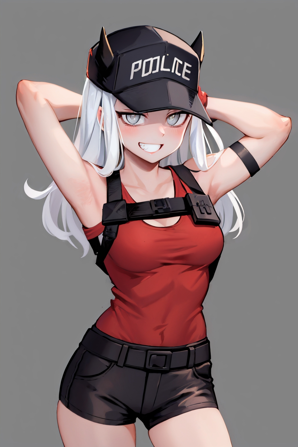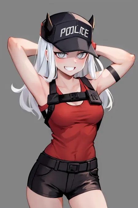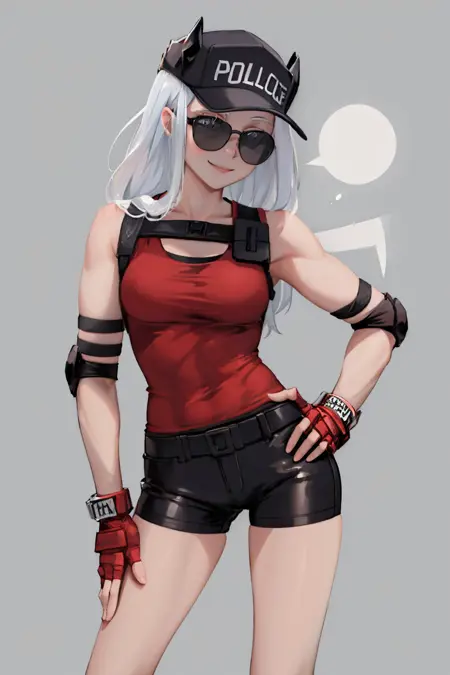 경찰 유니폼: htjusticepol, horns, hat, sunglasses, red shirt, red gloves, fingerless gloves, black shorts