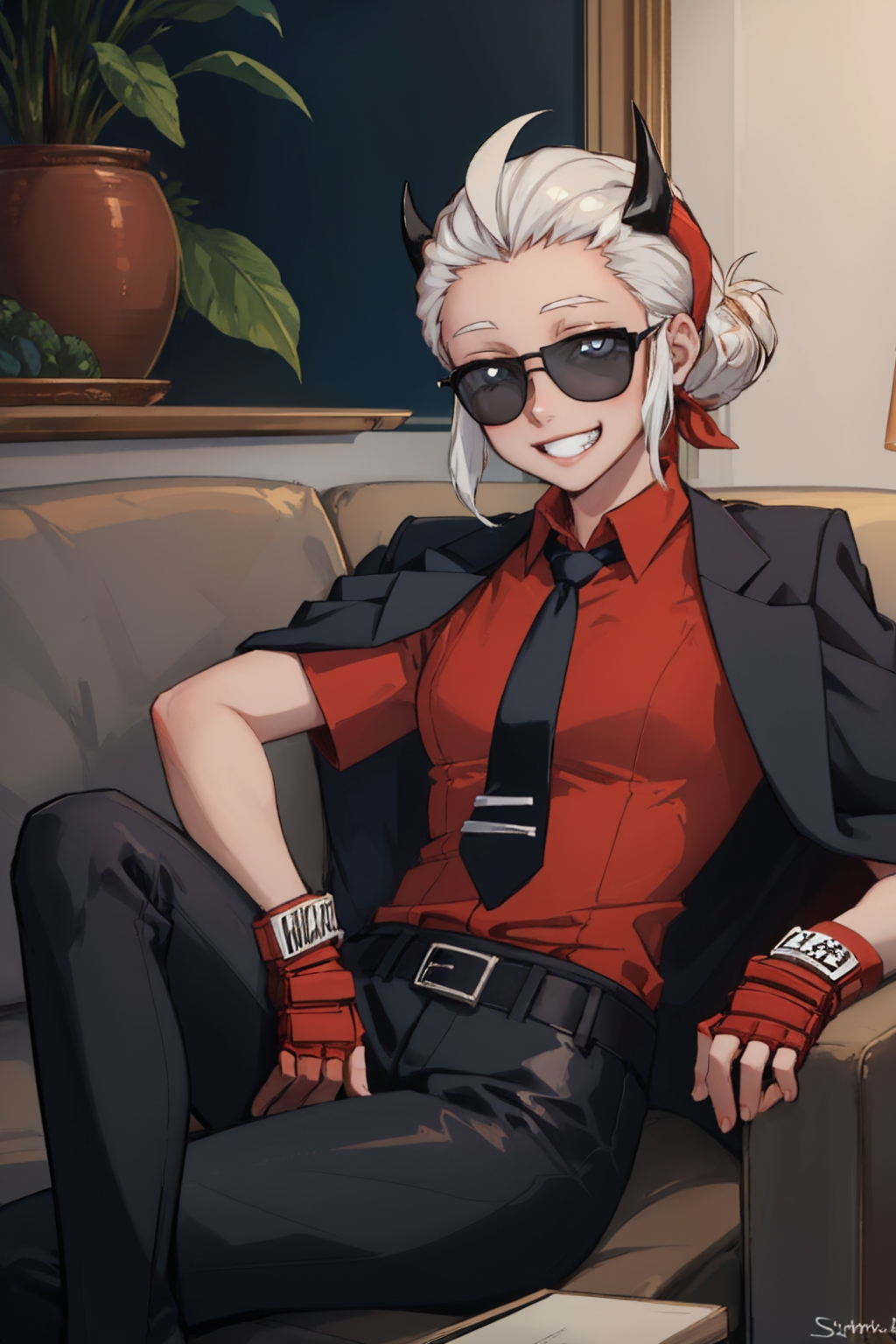 기본 옷차림: htjusticedef, horns, sunglasses, black jacket, jacket on shoulders, red shirt, black necktie, short sleeves, red gloves, black pants, belt