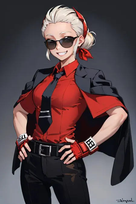 필요한 경우 white hair를 추가하세요. 원하시면 프롬프트에서 그녀의 sunglasses를 제거하고 grey eyes로 대체할 수 있습니다.