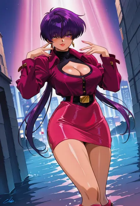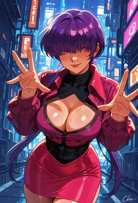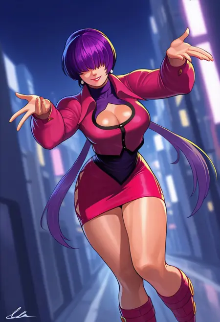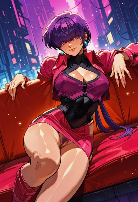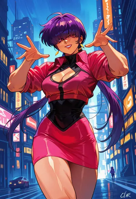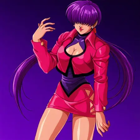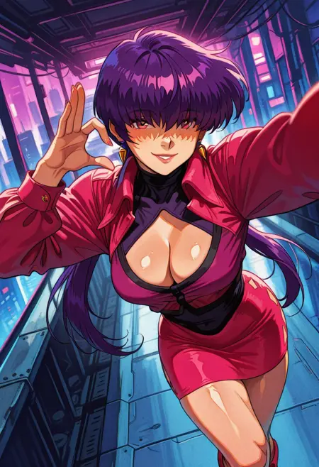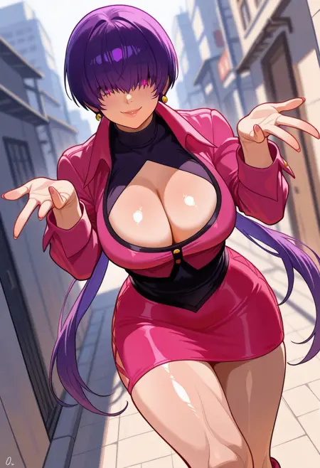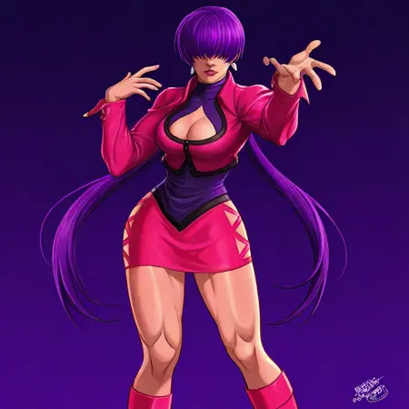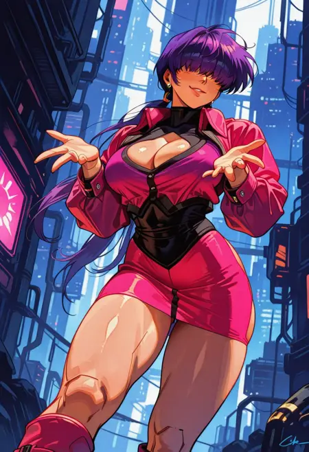 OrochiShermieKoF、1girl、solo、筋肉質な女性、パープルヘア、前髪、目隠しの髪、分割ポニーテール、鼻、唇、メイク、イヤリング、大きな胸、胸元、ピンクのカットアウトジャケット、服のカットアウト、胸元のカットアウト、パープルシャツ、ピンクのミニスカート、太めの hip、ピンクの膝上ブーツ