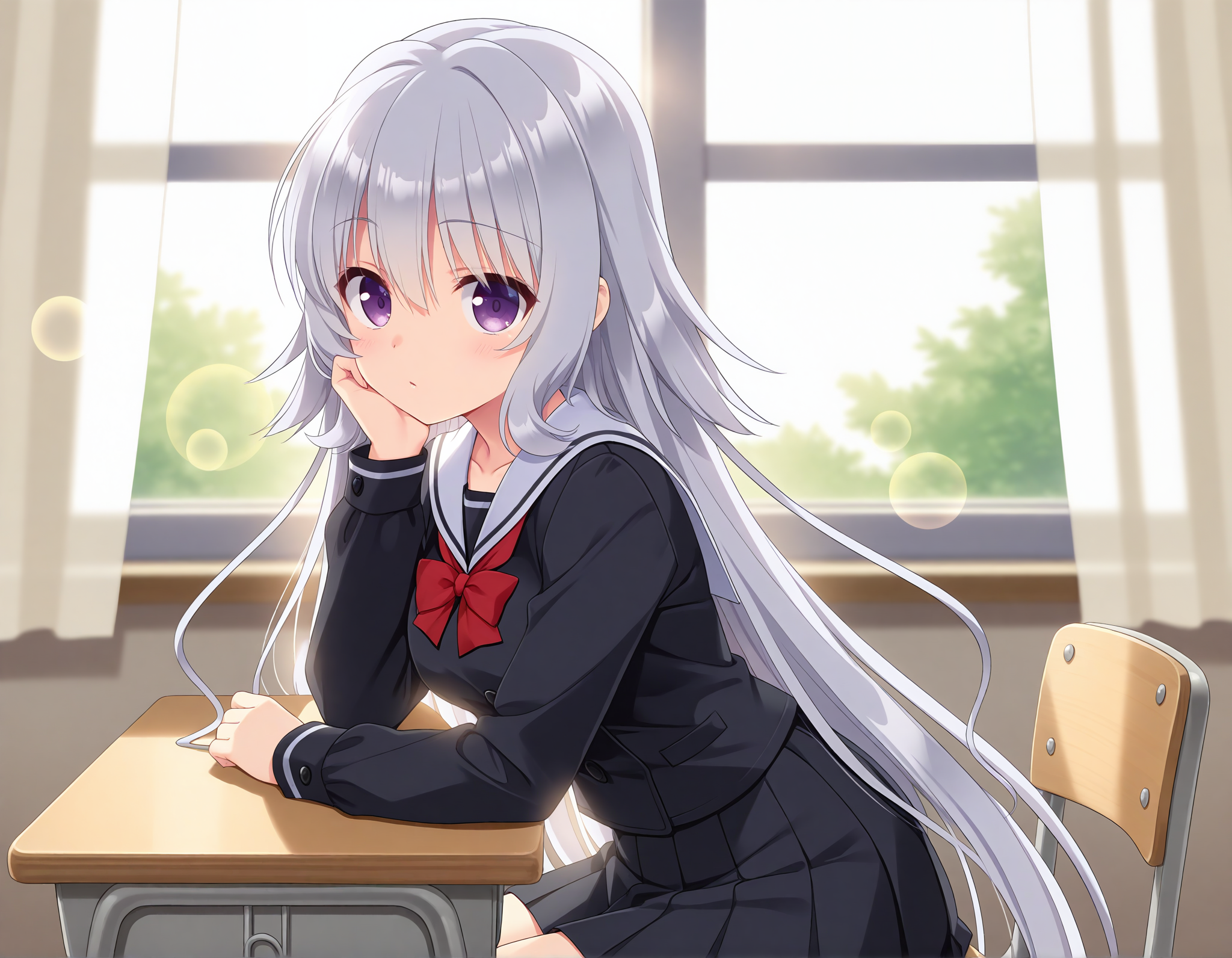 school uniform,pleated skirt,black skirt,long sleeves,white sailor collar,black serafuku,red bowtie,buttons,miniskirt,sleeve cuffs,