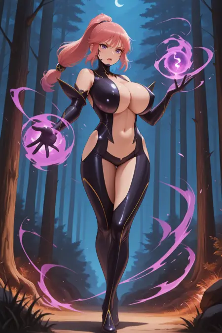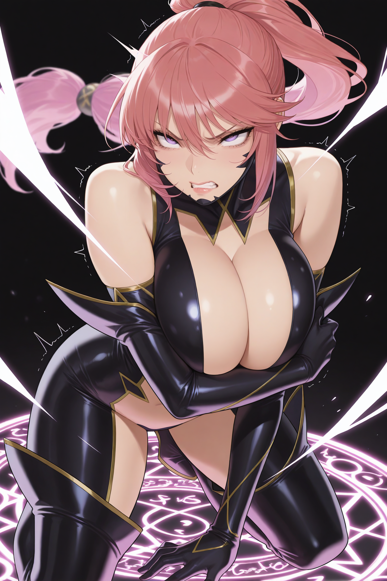 Trigger word is "kblche" and "pink hair, ponytail, purple eyes, lips" is required.
