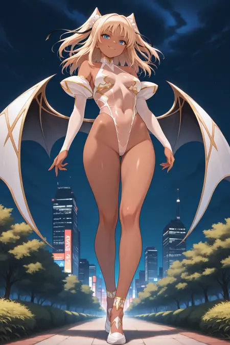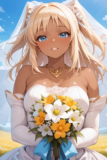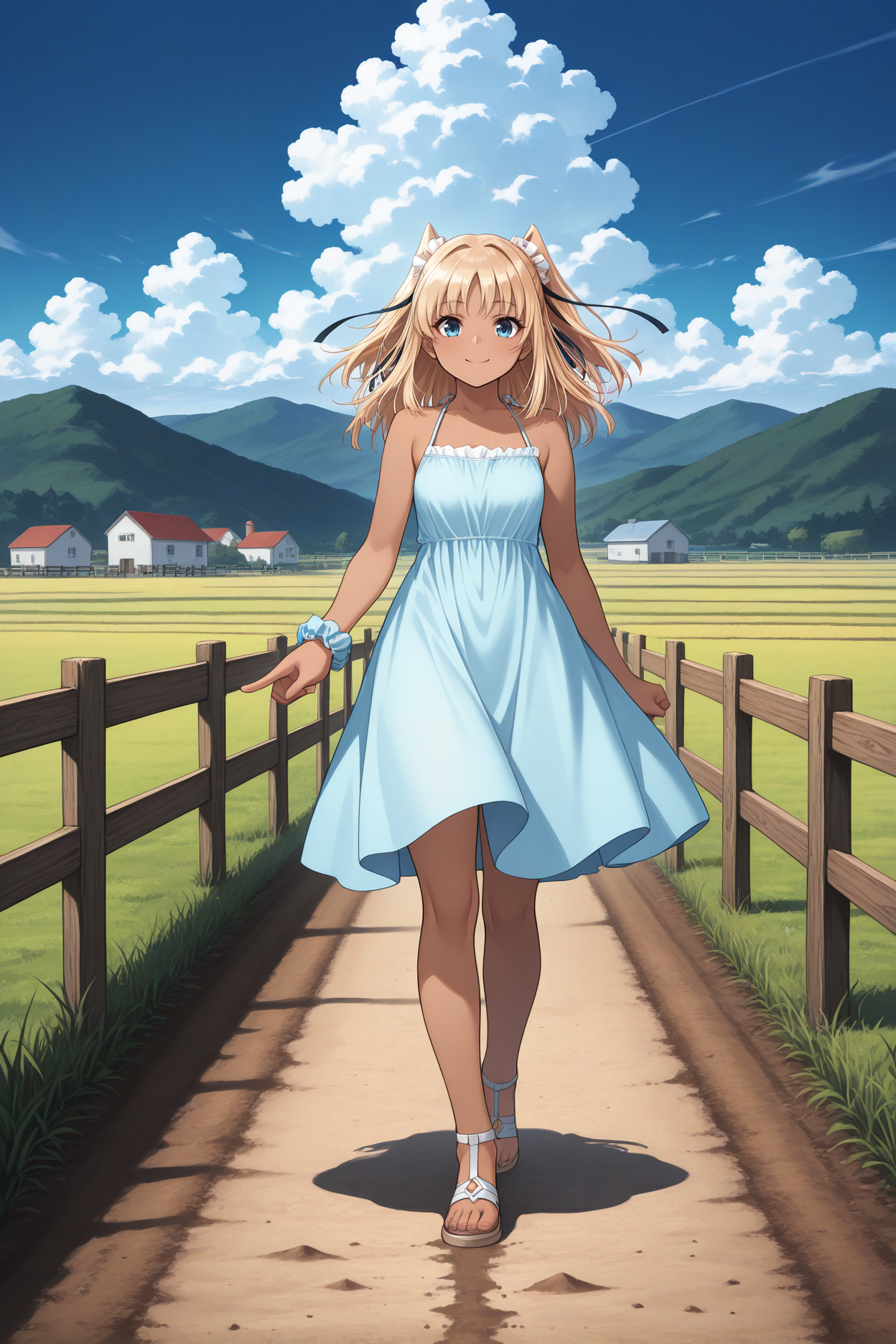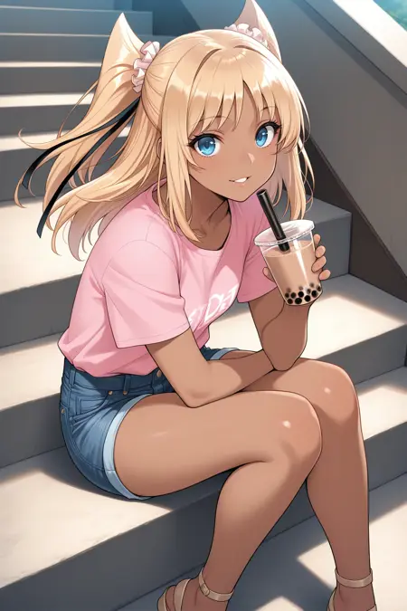 Trigger word is "ftrms" and "blonde hair, two side up, long hair, blue eyes, dark-skinned female" is required.